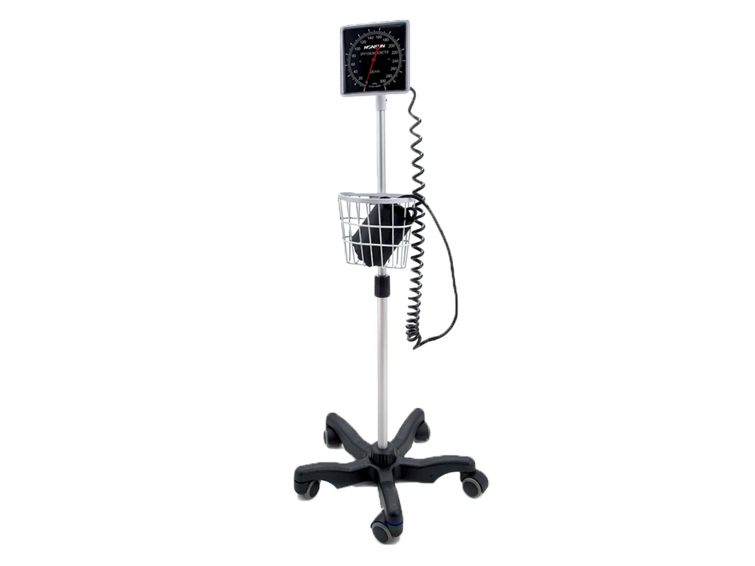 Sfigmomanometro su piantana a rotelle, leggero ma di grande stabilità con ruote girevoli di 360°.