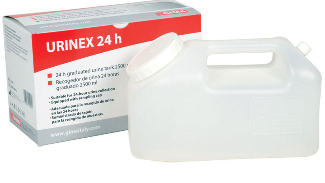 Contenitore in polipropilene per urine, graduato. Fornito in scatola singola.