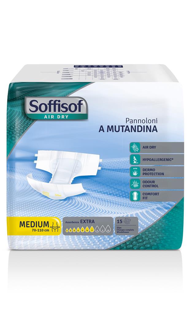 Il pannolone a mutandina Soffisof Air Dry EXTRA è indicato per incontinenza urinaria e/o fecale da moderata a grave e assicura la massima sicurezza e comfort a utilizzatori sia autosufficienti che allettati.