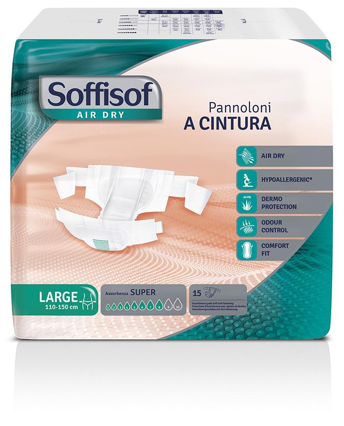 Il pannolone a cintura Soffisof Air Dry SUPER è indicato per incontinenza urinaria e/o fecale da media a grave e assicura la massima sicurezza e comfort a utilizzatori sia autosufficienti che allettati.
