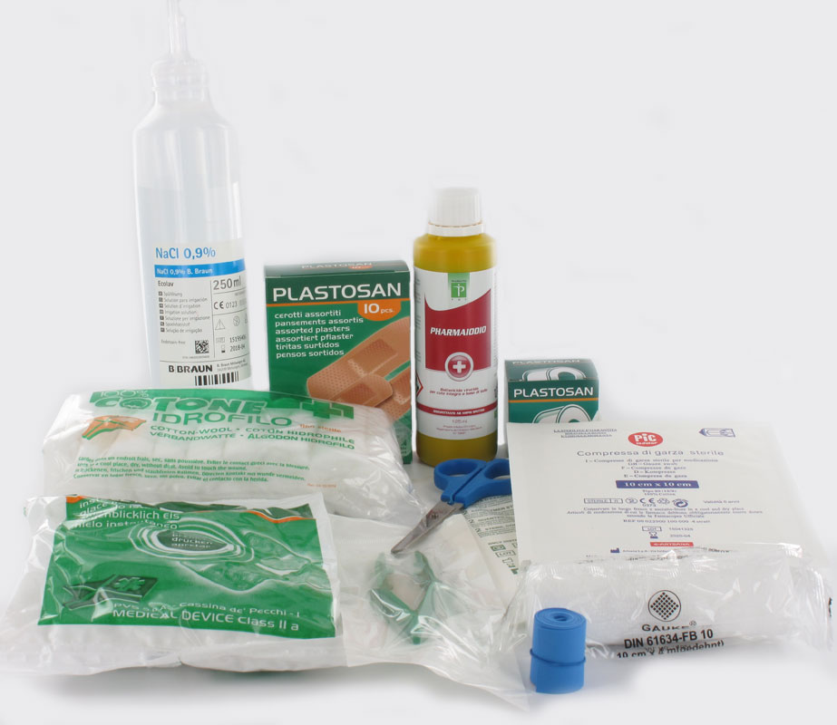 Il prodotto è fornito come pacco medicazione 'base' contenente materiale sterile monouso e presidi per la medicazione e il trattamento immediato delle ferite minori: disinfettante, soluzione fisiologica, garze sterili, cerotti, cotone idrofilo, forbici, pinza sterile, laccio emostatico e ghiaccio istantaneo monouso.