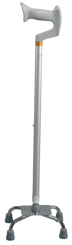 Quadripode base stretta con fusto in alluminio anodizzato e base in acciaio cromato. Manico anatomico aperto, puntali antiscivolo in gomma morbida.