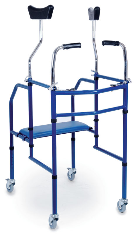Deambulatore pieghevole con appoggio sottoascellare regolabile in altezza. Costruito in acciaio verniciato blu con 4 ruote piroettanti di 80mm di cui 2 con freni, sottoascellari imbottiti con supporto regolabile in altezza, larghezza e profondità. Impugnatura anatomica. Può essere utilizzato con un sedile imbottito (optional).