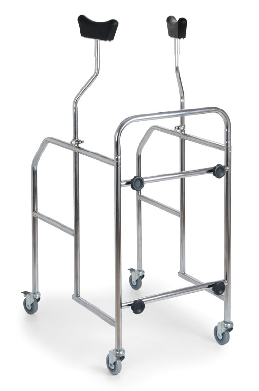 Deambulatore smontabile realizzato per sostenere persone con difficoltà di movimento. Costruiti in acciaio cromato con 4 ruote piroettanti di 80mm di cui 2 con freni, sottoascellari imbottiti con supporto regolabile in altezza, larghezza e profondità. Può essere utilizzato con un sedile imbottito (optional cod. 5300138).