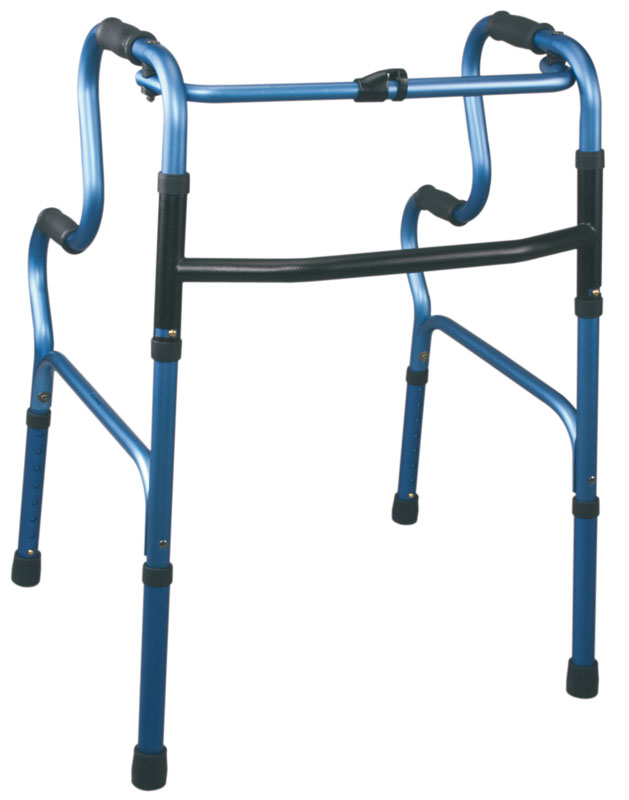 Deambulatore con 4 puntali, pieghevole costruito in alluminio anodizzato colore blu. Doppio livello di impugnatura per facilitare l’alzata della persona dalla posizione seduta. Manopole imbottite, puntali in gomma antiscivolo.