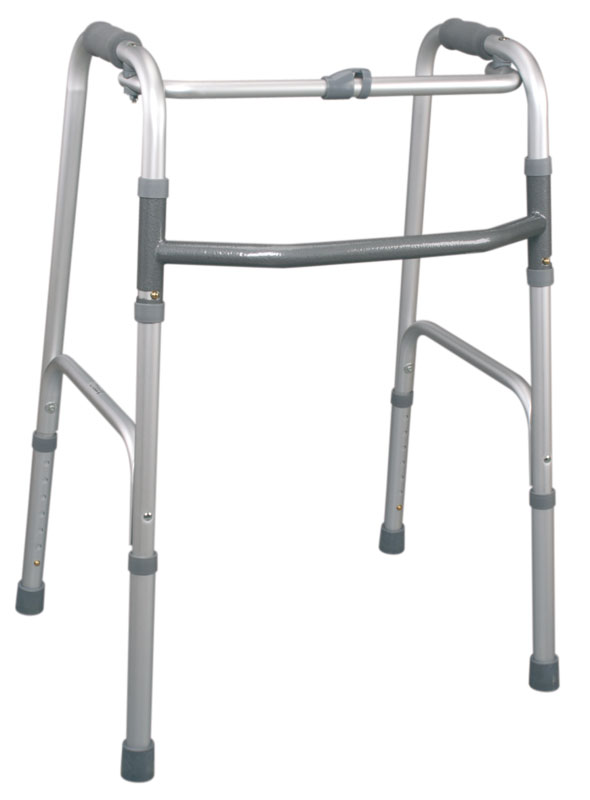 Deambulatore pieghevole con pulsante, costruito in alluminio anodizzato leggero con manopole imbottite e con 4 puntali in gomma antiscivolo.