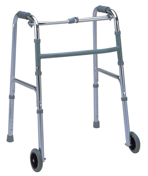 Deambulatore in alluminio con 2 gommini antiscivolo e 2 rotelle. Altezza regolabile da 79 a 97 cm.