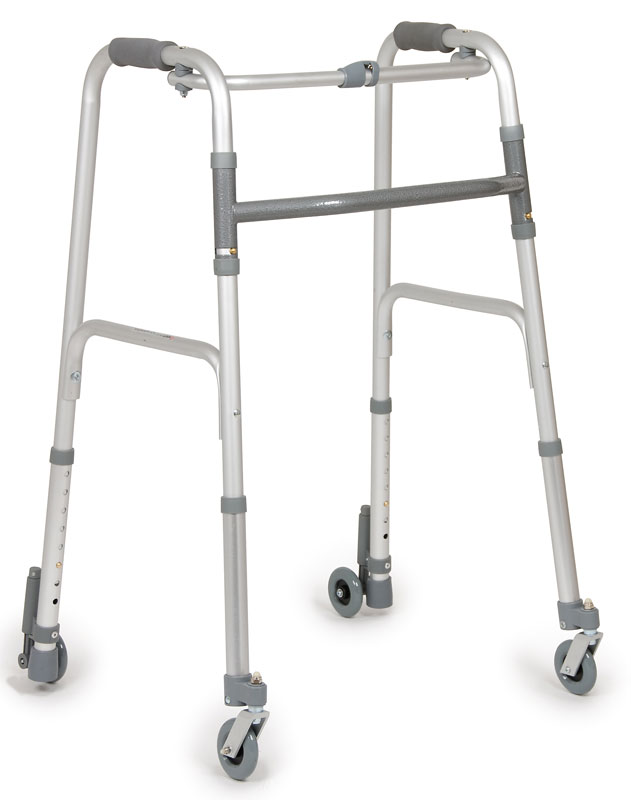 Deambulatore pieghevole con un pulsante, costruito in alluminio anodizzato con manopole imbottite. Dotato di due ruote piroettanti frontali e due ruote posteriori con sistema autobloccante.