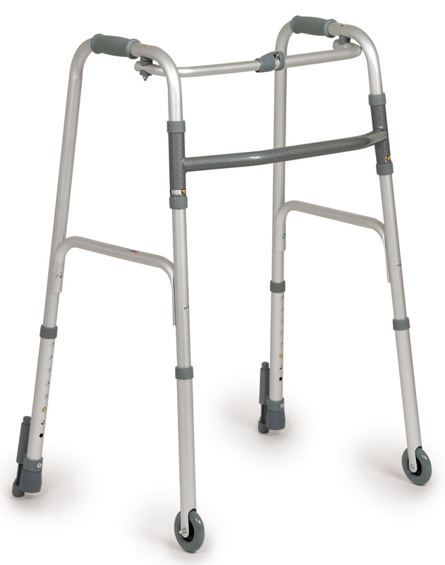Deambulatore pieghevole con un pulsante, costruito in alluminio anodizzato con manopole imbottite, dotato di due ruote fisse frontali e due gambe posteriori con puntali con sistema autobloccante.
