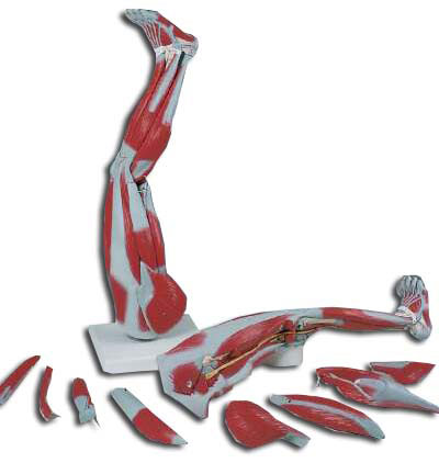 Modello in 9 parti, su base staccabile che illustra i muscoli superficiali e profondi della gamba sinistra, con il piede. Otto muscoli si possono staccare e studiare in dettaglio. Muscoli, tendini, vasi, nervi e ossa sono accuratamente rappresentati e numerati.