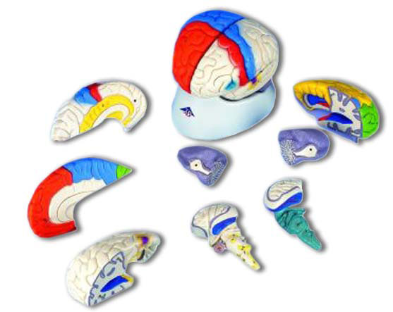 Questo modello funzionale di cervello, con sezione mediana, illustra sul lato destro la corteccia cerebrale con aree distinte per colore.