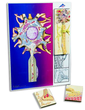 Serie che illustra le strutture elementari del sistema nervoso umano. Ognuno dei 5 elementi mostra una raffigurazione plastica in rilievo ed a colori di un componente della cellula nervosa. Per praticità di composizione e conservazione le basi sono dotate di magnete, per cui i singoli modelli si possono applicare sulla tavola metallica con la relativa illustrazione. I 5 elementi sono disponibili anche singolarmente.