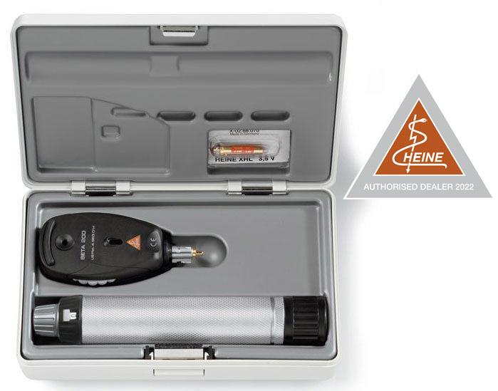 Oftalmoscopio alogeno Heine Beta 200 con ottiche asferiche di qualità superiore. Sistema ottico unico.