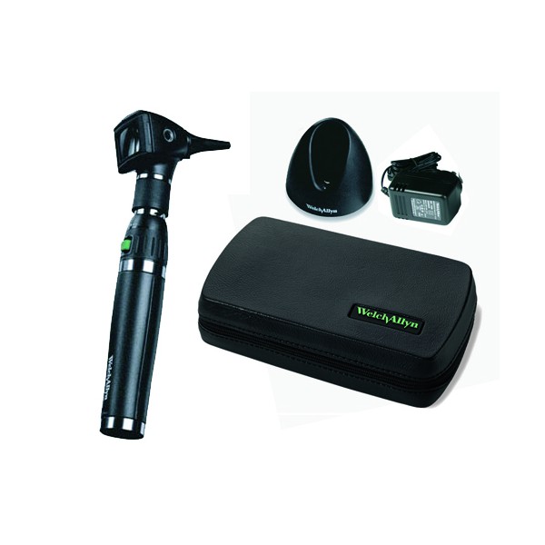 Elite otoscopio composto da testa otoscopio Professional 3,5V a fibre ottiche, lampadina HPX, con lente orientabile scorrevole, completo di illuminatore laringeo, sistema a tenuta ermetica e connessione per test pneumatico e 4 specula riutilizzabili (2,5-3-4-5 mm), e manico ricaricabile al litio.