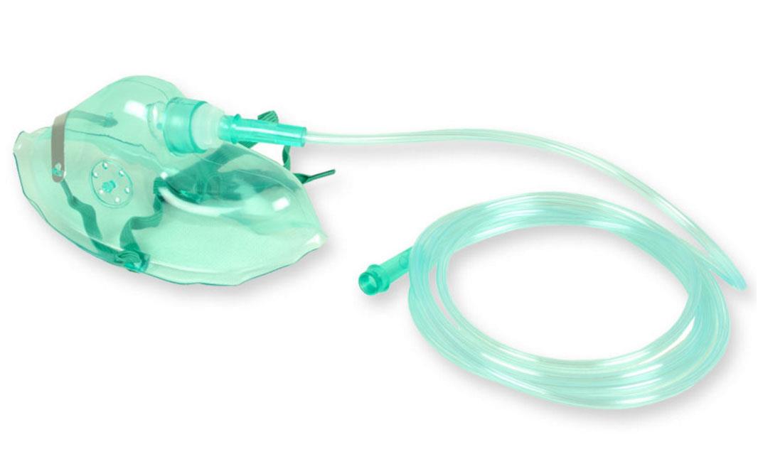 Mascherina monouso, morbida, per ossigenoterapia a concentrazione media e fissa, completa di tubo ossigeno antischiacciamento, clip stringinaso ed elastico.