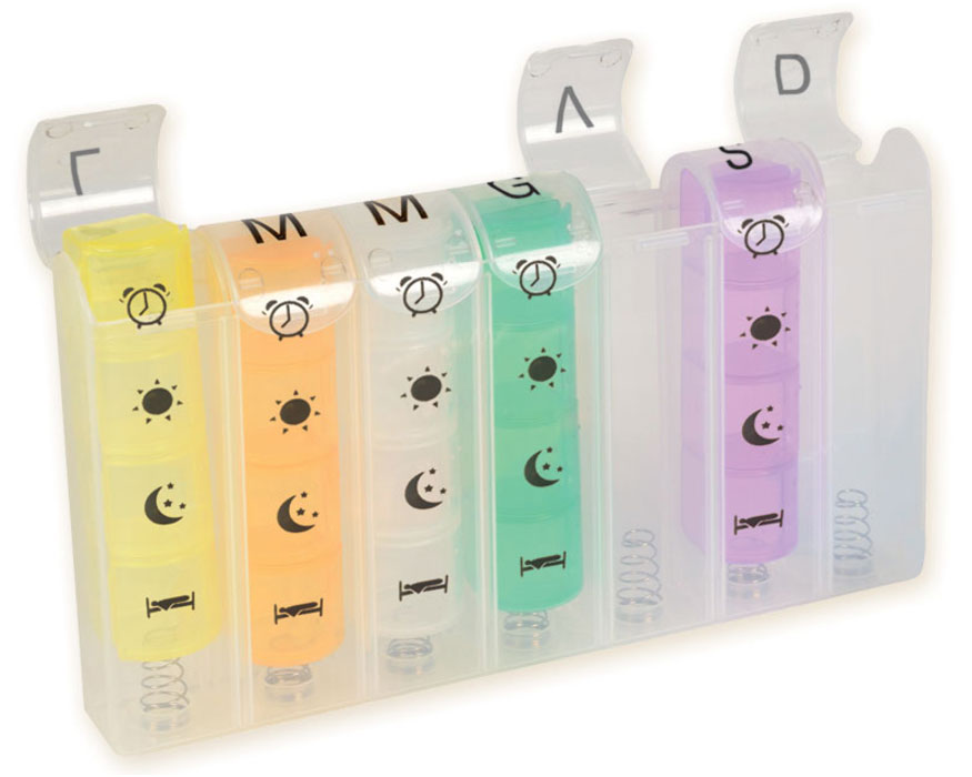 Portapillole a molla, programmato per 7 giorni, con scomparti rimovibili e suddivisi in 4 sezioni.